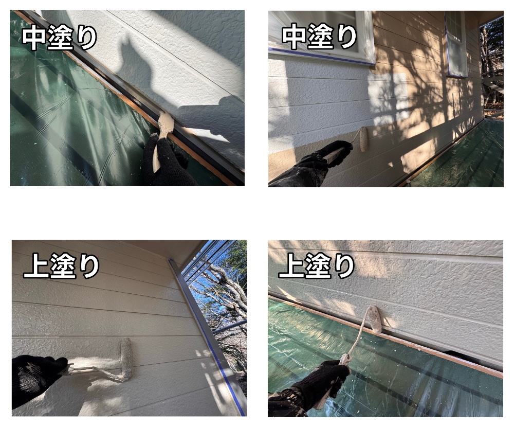 下塗り、中塗り、上塗りの3回塗装を行う事で耐久性のある時膜厚を形成します。