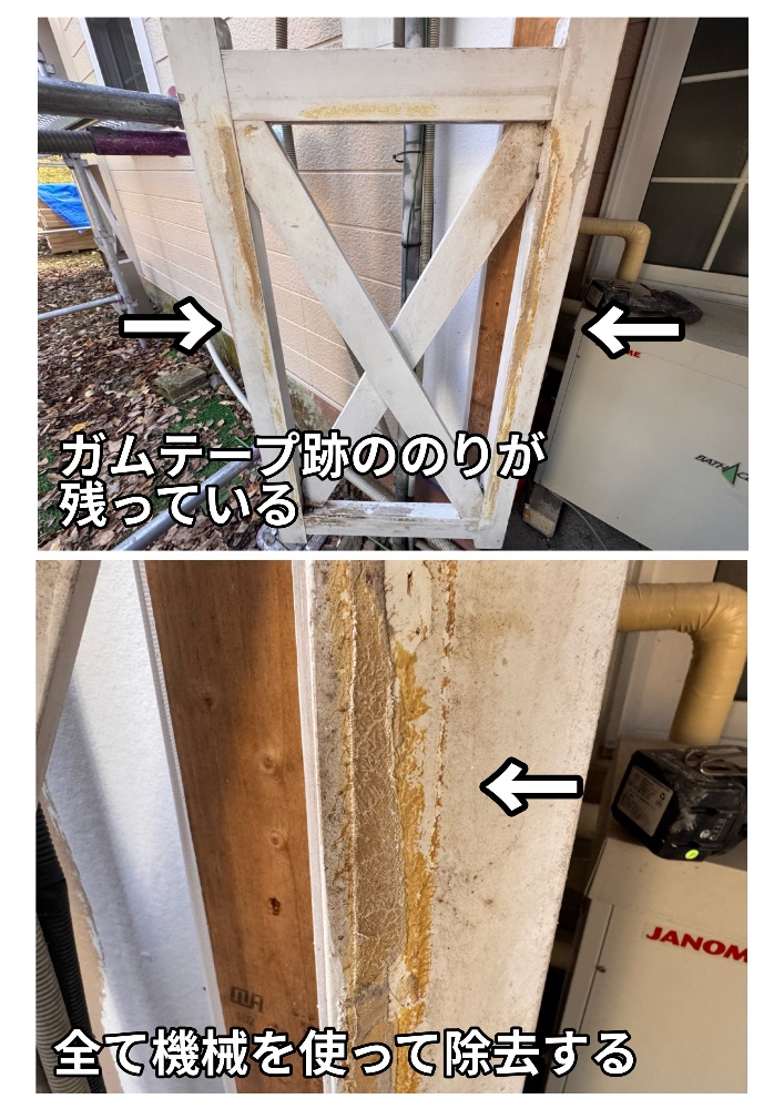 ガムテープのりがしっかり残っていたためサンダーを使って全て除去しました。