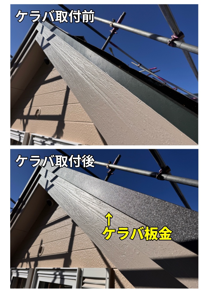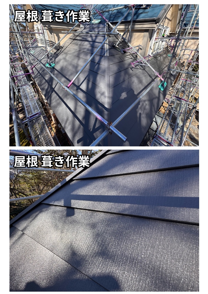| 屋根の進み具合 葺き替え | ・スターター取付完了 ・防水シート施工完了 ・ケラバ取り付け完了 ・葺き作業中 |