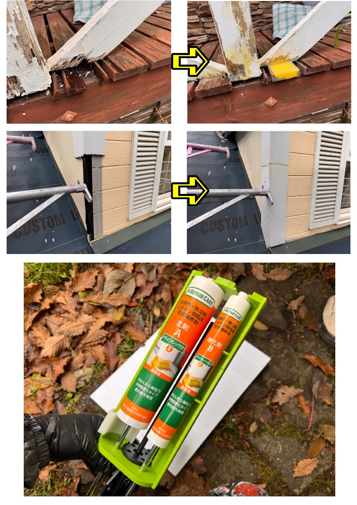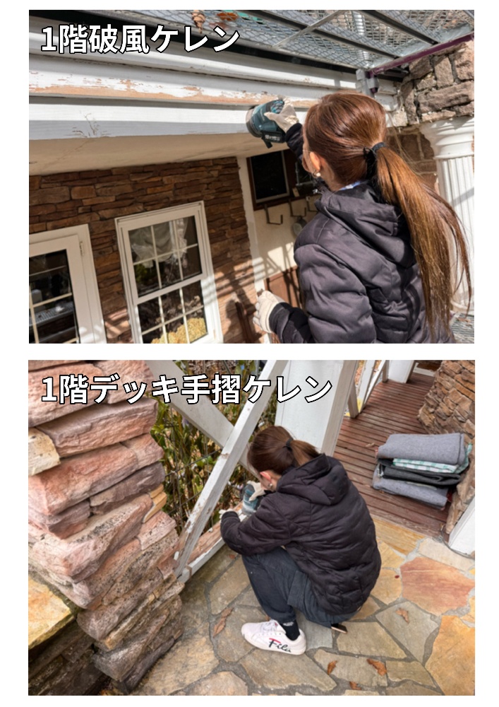 | 木部の進み具合 塗装仕様 | 高圧洗浄完了 2階破風のケレン完了 2階破風塗装が完了 2階化粧柱完了 1階破風中塗り完了 1階破風仕上げ 1階デッキ手摺仕上げ |