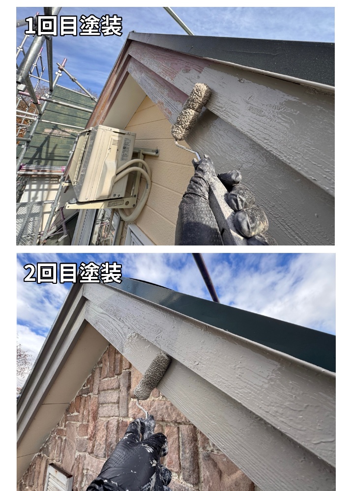 2階の小壁の仕上げ塗装と同時に1階の破風仕上げ塗装も進めました。