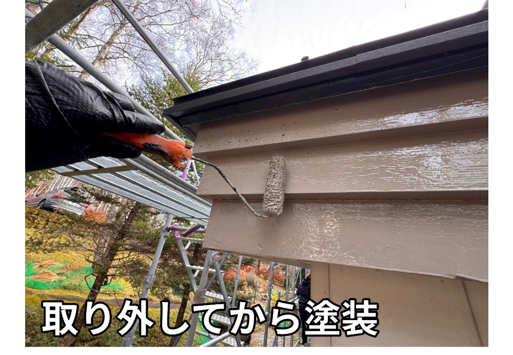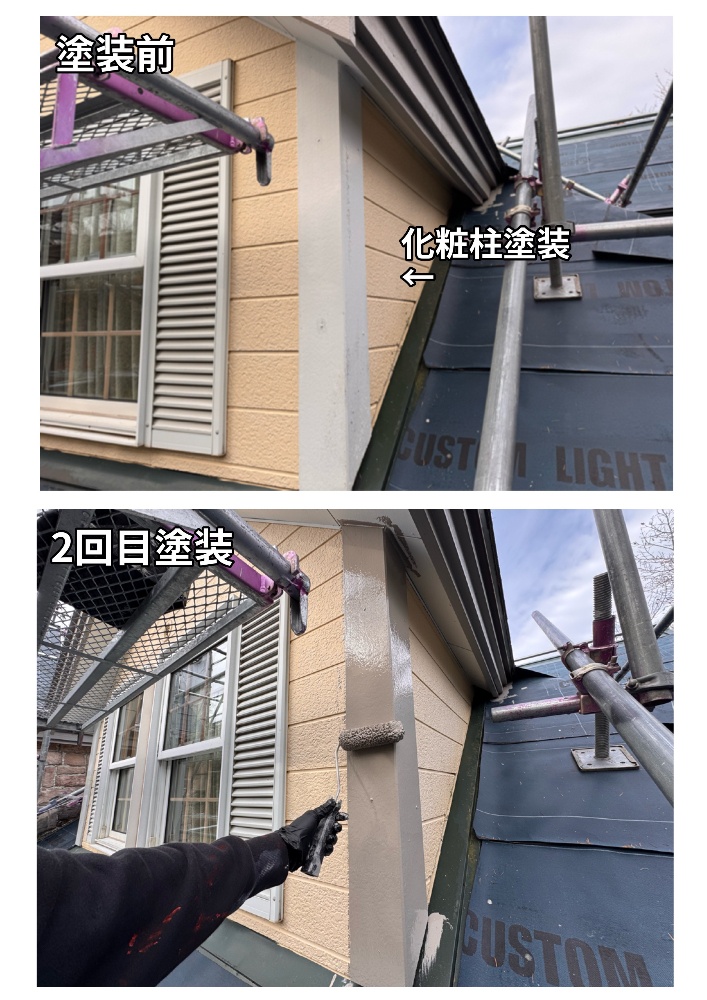 2階の外壁の角に付いている化粧柱も破風と同じ色で統一して塗ります。