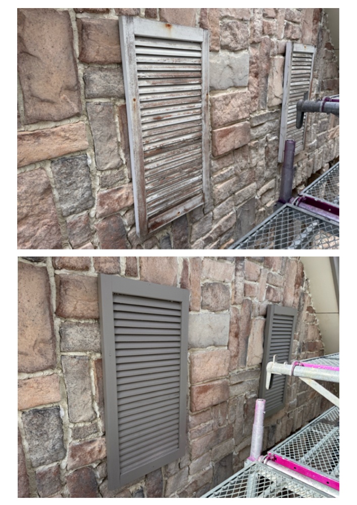 飾りのガラリも傷みで塗装が剥がれていたので下処理をしてから破風と色を合わせて3回塗装で仕上げました。