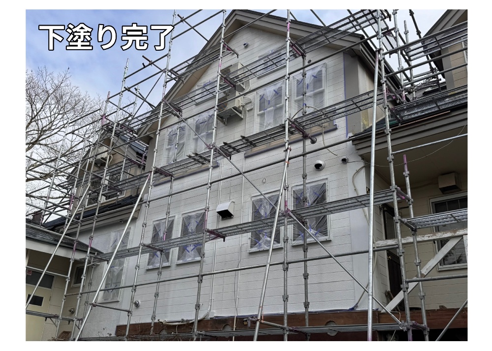 | 外壁の進み具合 フッ素塗装 | 高圧洗浄完了 各部補修作業 2階壁下塗り中塗りまで完了 2階小壁仕上げ完了 西面壁一部完了 東面北面完了 北面入り組み壁完了 |